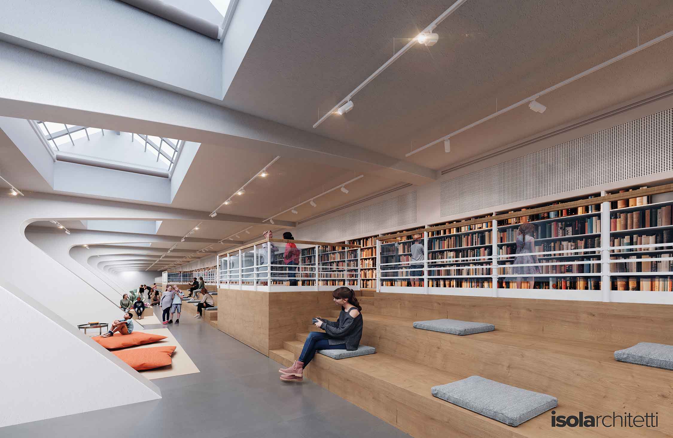 Nella zona di ingresso si organizzeranno anche i servizi di informazione e di consultazione del catalogo (tradizionale e digitale), il prestito e la restituzione assistiti. L’offerta di spazi e servizi della biblioteca si completerà con l’organizzazione nel piano interrato del sistema del deposito dei volumi e dei magazzini librari (illuminati in modo suggestivo da pozzi di luce naturale); al primo piano invece si collocheranno spazi di coworking, sale private e laboratoriali utilizzabili per attività di natura formativa ed informativa.