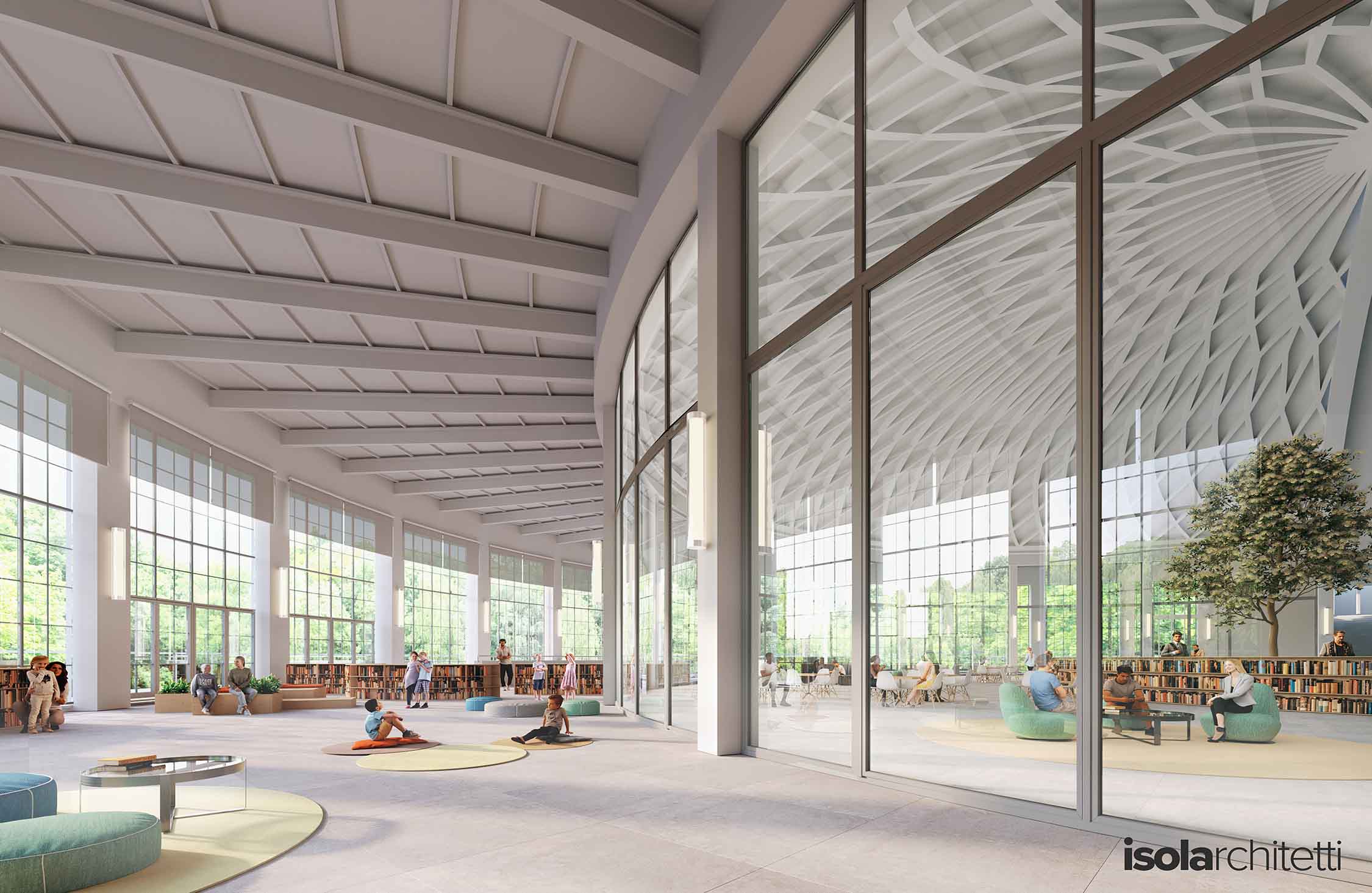 Per preservare la spazialità e valorizzare l’architettura esistente, il piano terreno rimarrà aperto e libero da strutture che possano impedire la percezione dell’intero padiglione, lasciando così ai visitatori la possibilità di godere a pieno della grande copertura voltata, in continuità con l’affaccio sul parco nella parte finale dell’abside, dove sedute e spazi destinati alla lettura in prossimità delle grandi vetrate contribuiranno a valorizzare la fruizione delle viste verso l’esterno e il contatto con la natura.