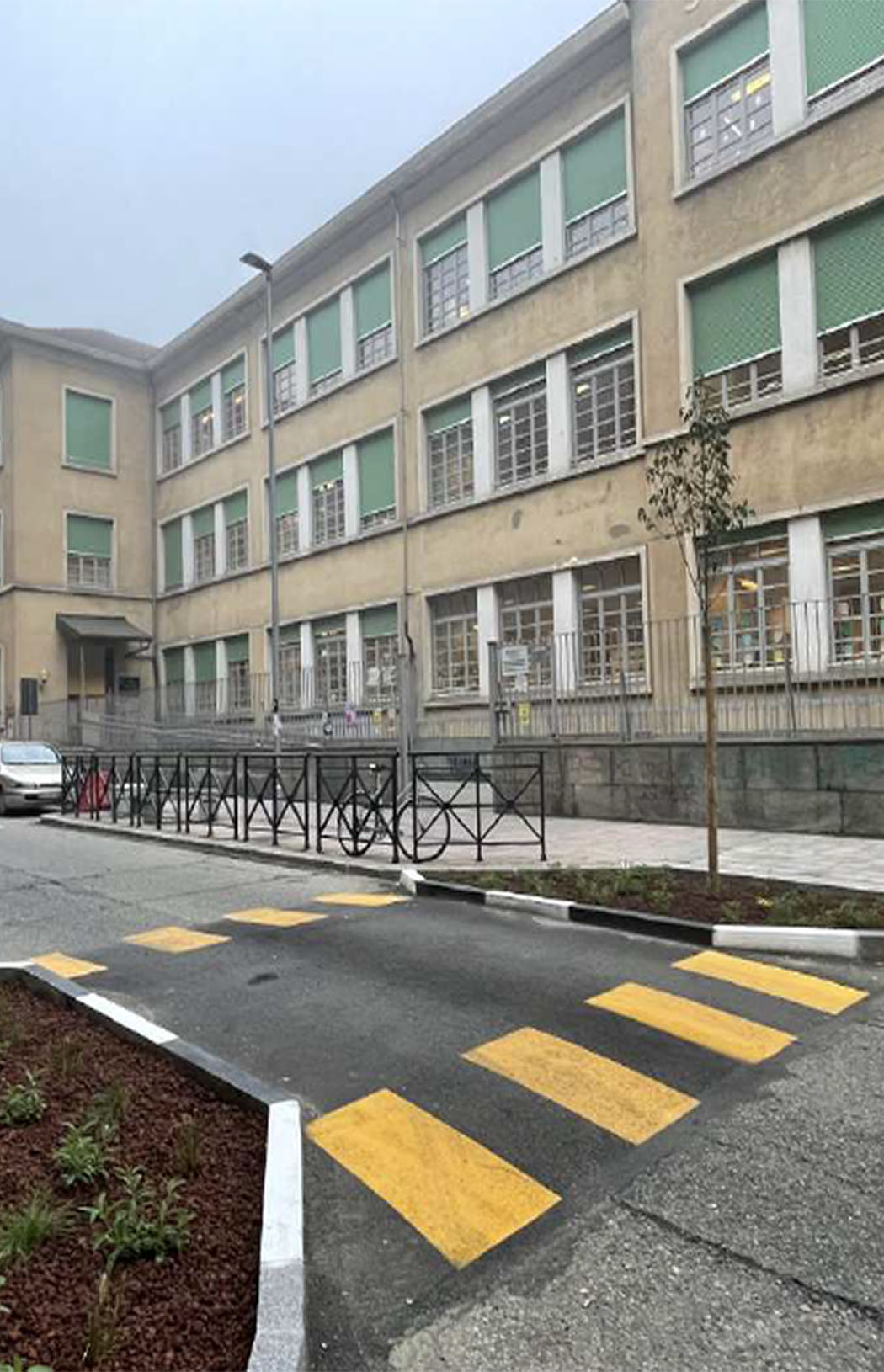 L’intervento ha riguardato l’allargamento degli spazi pedonali in prossimità dei due ingressi pedonali alla scuola, il marciapiede è stato ampliato inglobando l’area dei parcheggi, è stato realizzato un restringimento della carreggiata con l’inserimento di due aiuole verdi con la duplice funzione di permeabilità e di raccolta delle acque meteoriche dalla strada.