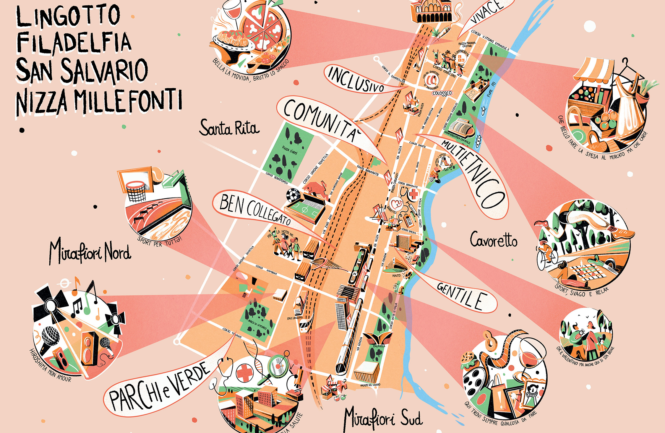 Ogni mappa include un breve inquadramento della parte di città cui fa riferimento e dei principali elementi condivisi che sono emersi durante le attività di Voci di Quartiere. Le illustrazioni hanno il compito di mostrare le principali indicazioni qualitative raccolte nei diversi quartieri e di restituire ciò che ci è stato raccontato.